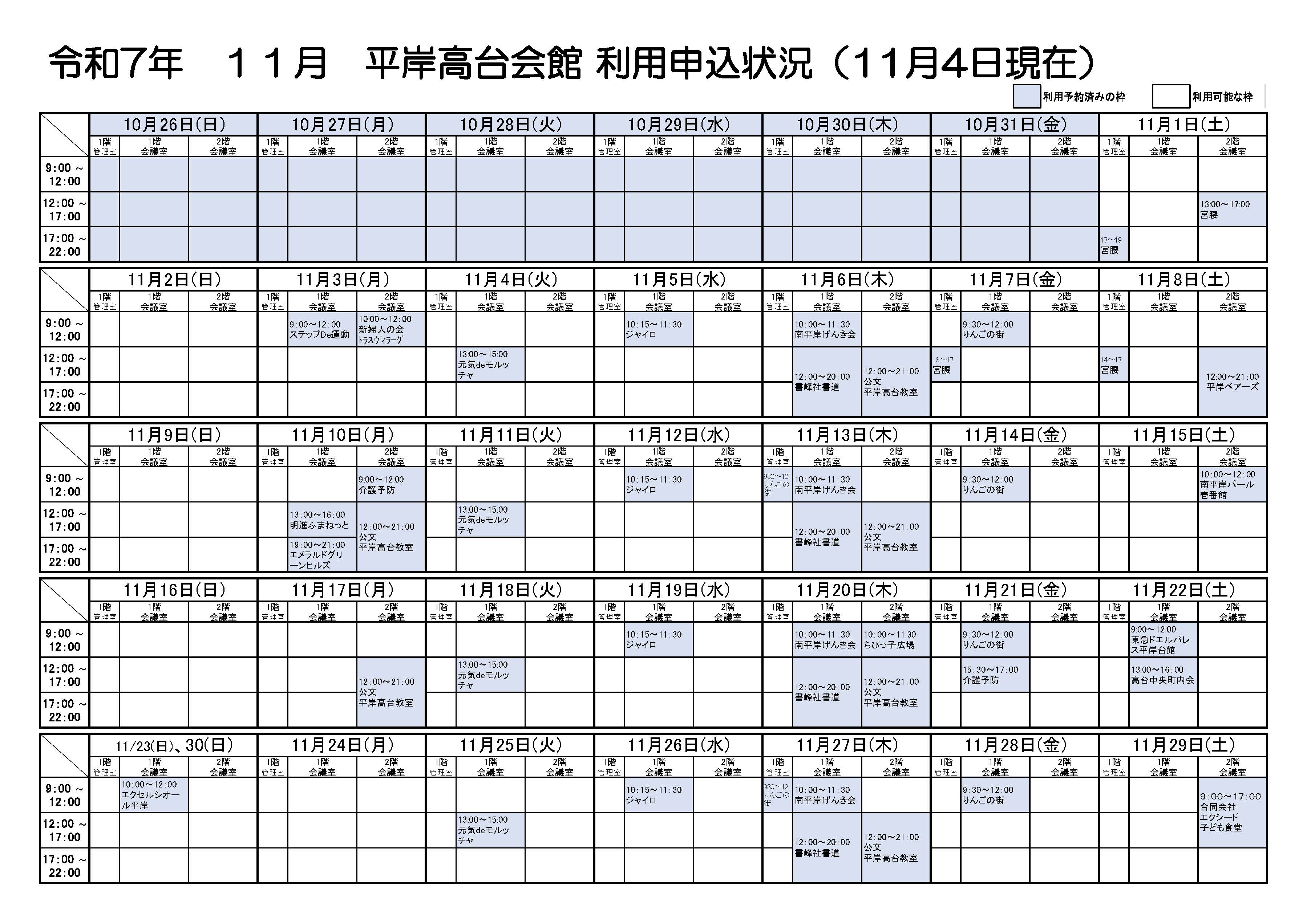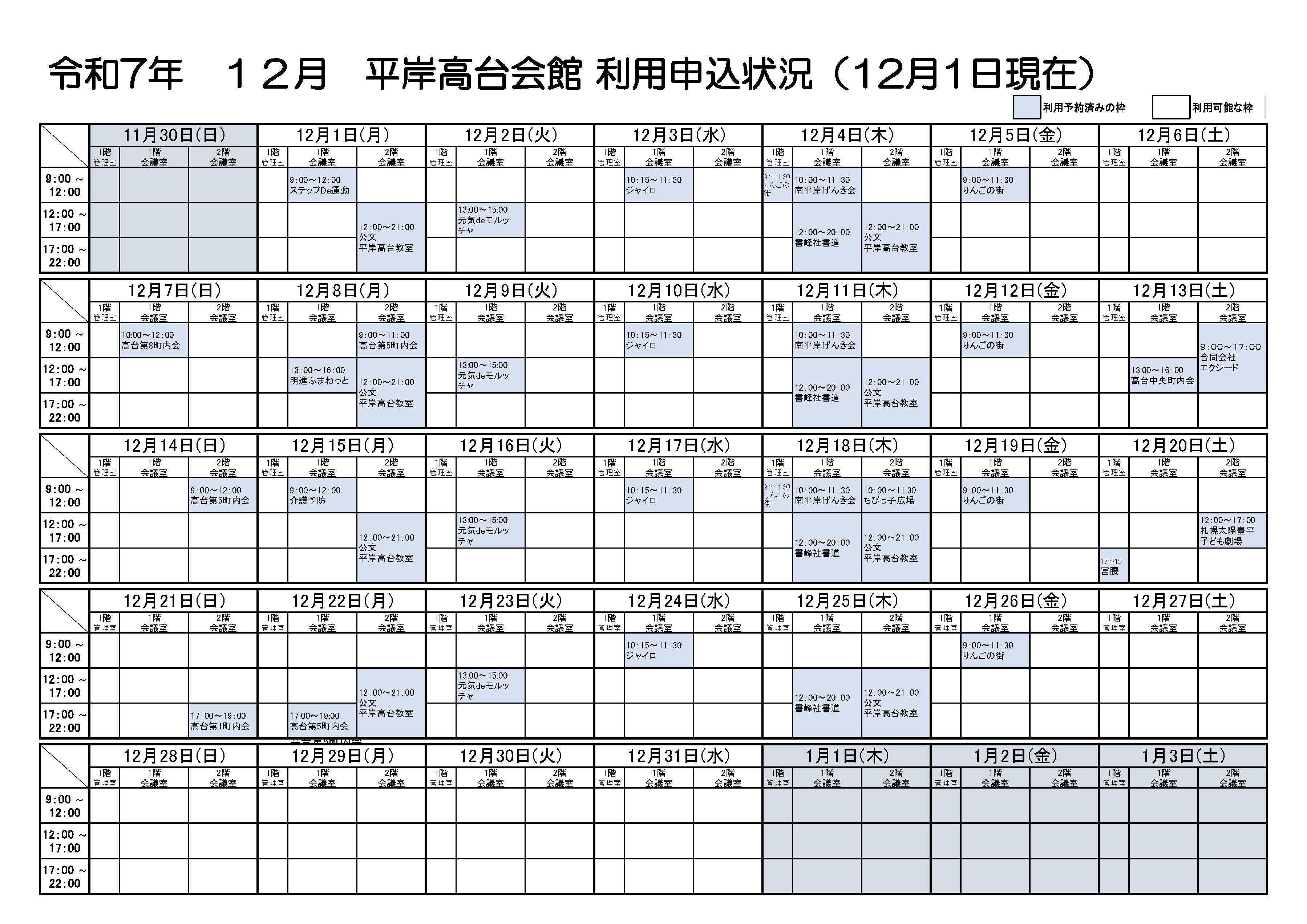 ※利用申込状況は適時更新いたしますが最新の状況は平岸高台会館へ直接お問い合わせ下さい。